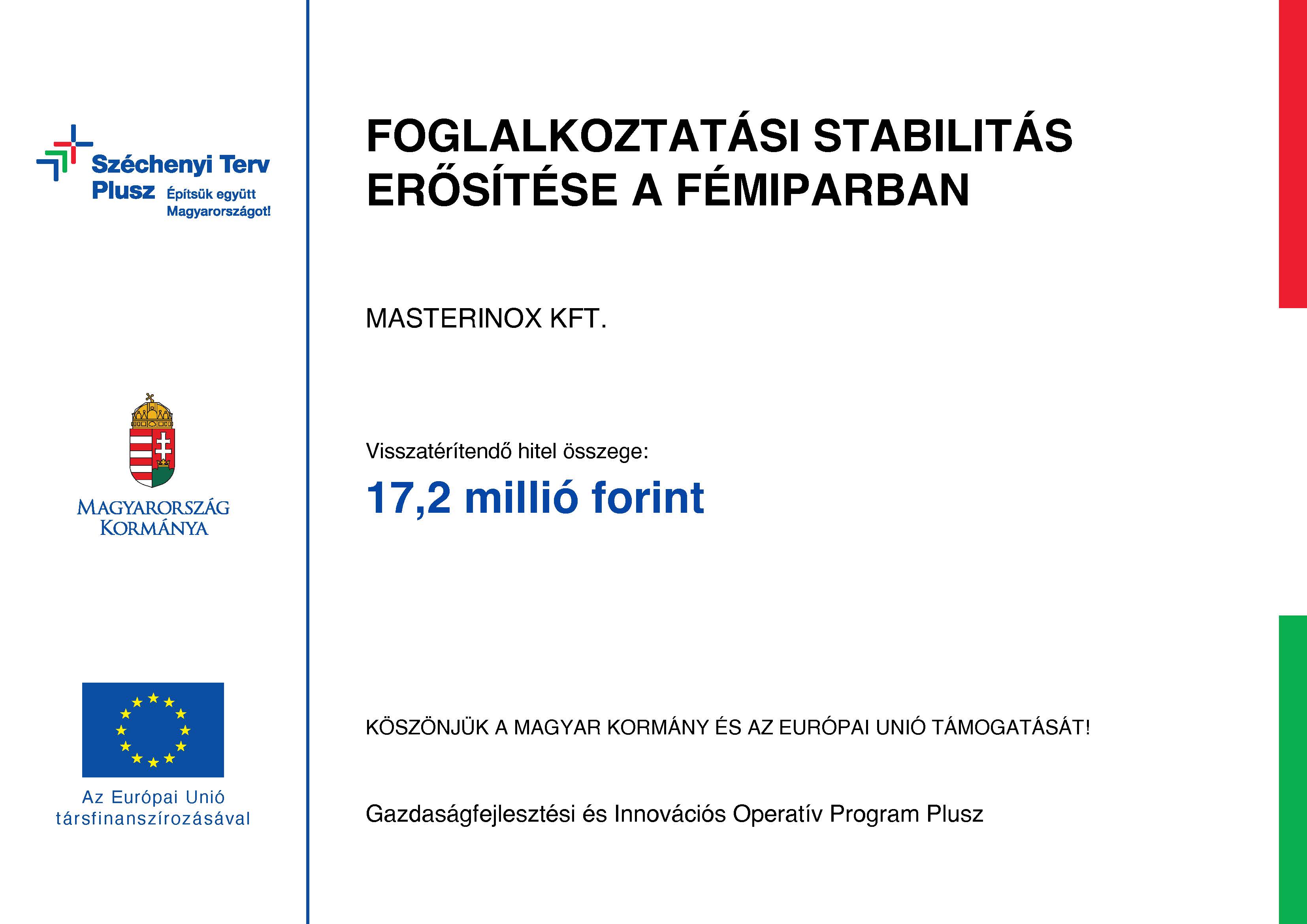 A MasterInox Kft. sikeres pályázatot nyújtott be a Gazdaságfejlesztési és Innovációs Operatív Program keretén belül a Nemzetgazdasági Minisztérium által meghirdetett „Gyakornoki program pályakezdők támogatására” című pályázati felhívásra, és így 3.458.581,-Ft vissza nem térítendő Európai Uniós támogatást nyert a projekt megvalósításához.